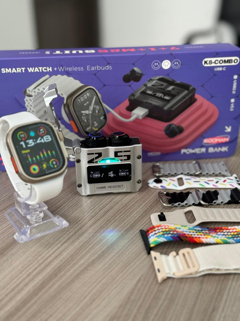 El Combo Gamer K8 es el paquete definitivo para quienes buscan tecnología, estilo y practicidad en un solo lugar. Incluye un SmartWatch Ultra 2, audífonos gamer con powerbank integrado, 7 pulseras intercambiables y 2 cargadores. Un combo completo pensado para quienes quieren rendimiento y variedad sin pagar de más.